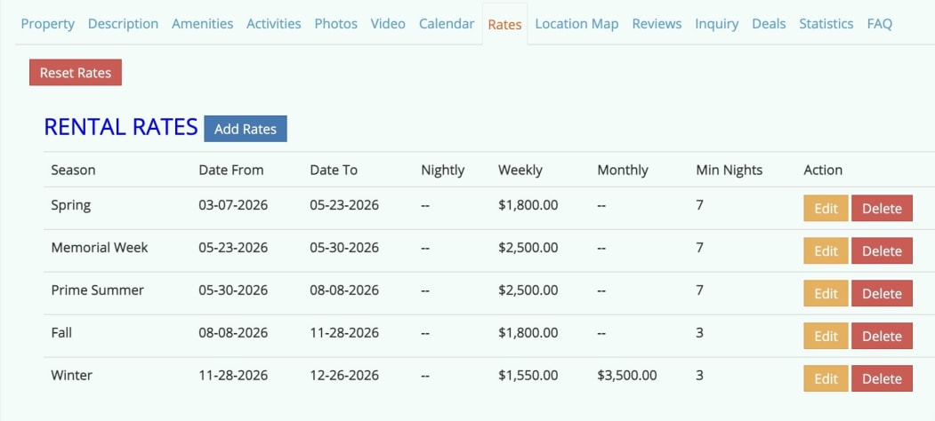 | From/To | Nightly | Weekend | Weekly | Monthly | Min Nights |