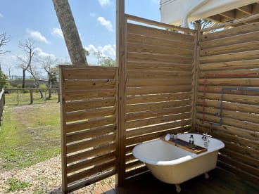 Outside there is a great deck for outdoor entertainment. The hot tub was a hit with the grands but I loved the claw footed tub for relaxation.