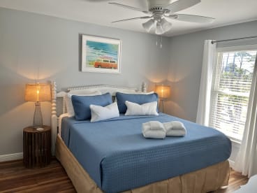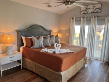 The beds are soft and comfortable with great linens. The bathrooms are updated, clean and beautiful. Most everything in the homes is new and clean. The climate control is on point and easily adjusted. The King size beds are a great choice and even with big beds the rooms feel spacious and not cramped.