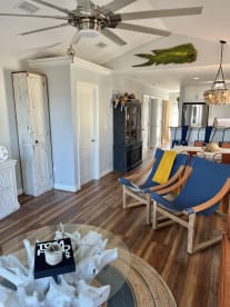 I can’t say enough about this charming beach house. The decor was beautiful with very unique pieces. Kitchen fully stocked, which is great to know prior to arriving. You do not need to bring anything from home. Beautiful sunrises on the bay and a short walk to the gulf. The owner thought of everything for a truly VIP experience.