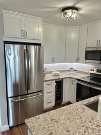 The appliances are all new and clean, fulfilling all our needs. We were pleased to find a fully stocked kitchen right down to the tiny important things you didn't think you needed. Even the utensils and cookware are top quality and healthy minded. We did not use the TVs much but they are new, smart, huge and quality.