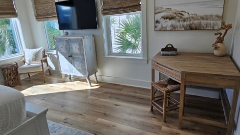 SECOND FLOOR King Bedrooms 4 and 5 and the 8 bed Bunkroom Kids Retreat are found on the 1st floor. Again, each bedroom has its own private bathroom. These 2 large King bedrooms have Gulf views. Bedroom 4 has a desk for any remote work needs. The Bunkroom has its own living room with a 75” TV and bathroom. Each bunk is designed for privacy and has its own cubby, light, and charging outlets.