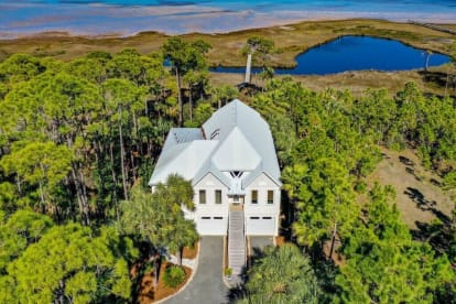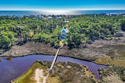 Inside, the open floor plan features walls of windows, a well-appointed coastal-designed living space with ample seating, electric fireplace, chef-suited kitchen, dining for 8, and a screened-in porch that spills out from the great room, making it easy to take advantage of the gulf breezes in any weather. The alfresco dining area and comfortable lounge seating is where you’ll find yourself enjoying the magnificent Cape San Blas sunsets, because let’s face it…a glass of wine tastes better with a view!