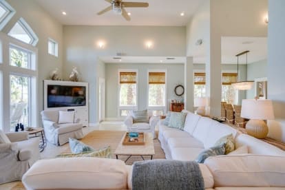Elevate your coastal living experience at Twin Gables with casual elegance and luxurious features. You will be amazed at the jaw-dropping panoramic views of the bay! Our light and airy home will immediately persuade you to slow down, breathe deeply and relax. Nestled amongst palms, palmettos, and pines reminiscent of “Old Florida,” this vacation home is unparalleled. This tranquil retreat awaits on 2 ½ acres of pristine coastal property!This rare single-level home is the perfect getaway for small families or two couples looking to rejuvenate and re-energize themselves by the beach and the bay. The pool can be heated for an additional charge of $50/day. Please add this at your time of booking.