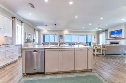 The main living area is open and spacious allowing for Gulf Views from wherever you are in the room. The main living area features a gas fireplace, a 55” smart TV, a wet bar featuring a beverage cooler and a 35 lb. ice machine. The large, open kitchen has quartz countertops, stainless steel appliances, double ovens, 2 dishwashers, and a large pantry fully stocked with small appliances and other supplies.