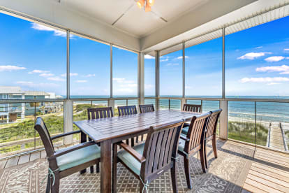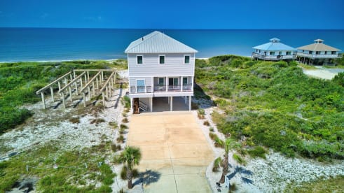 This beautiful Gulf front, North Cape home features 5 bedrooms, 5 1/2 bathrooms with 4100 square feet of living space and sleeps up to 13 people. Sea of Joy features an elevator providing access to all floors. The main living area is located on the top floor offering spectacular beach, gulf, and sunset views. The private walkway over the dunes to the white sand and beautiful gulf waters makes the almost private beach easily accessible.
