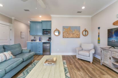 This home sleeps 13. The Master King suite is on the top floor with 2 additional Master King Suites on the 2nd floor. There is a 2nd Living Space with 55" Smart TV and Kitchenette that comes with Mini Refrigerator, Microwave, Toaster, Keurig and Coffee Maker. One Queen bedroom with a day bed and a bedroom with 2 sets of bunk beds, complete the sleeping accommodations.