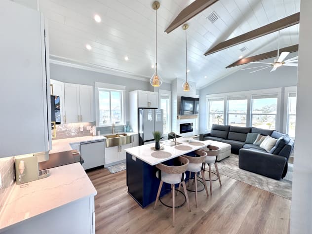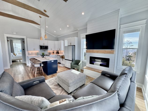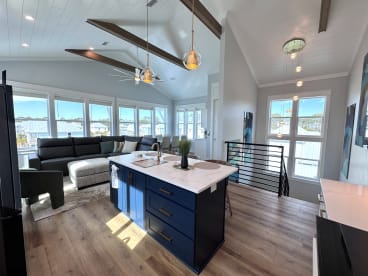 Cozy up by the fireplace or start your day at the custom coffee bar with views of the water. Ideal for peaceful mornings and relaxing evenings.
