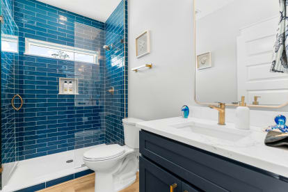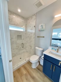 The master suite is a haven of luxury with an oversized shower featuring a full glass wall, offering unobstructed views as you unwind.
