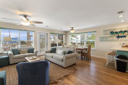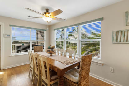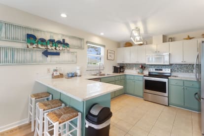 Step inside and be greeted by a fully stocked kitchen, ideal for whipping up delicious meals after a day of sun and surf. Enjoy your culinary creations in the inviting dining area or take them outside to our large beachfront porch, where you can enjoy the ocean breeze and stunning sunset views.