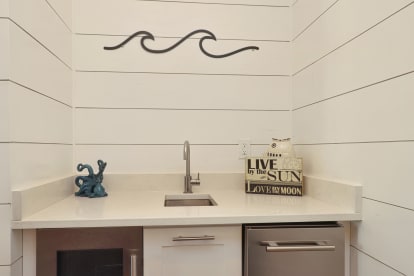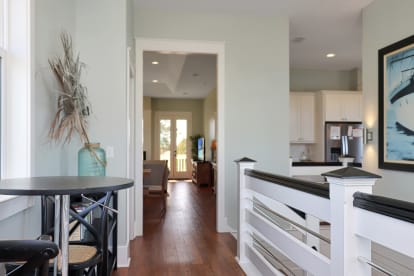 The first floor has a large den opening to a covered deck and the privacy of an undeveloped coastal barrier zone. There is a nature path winding to the beach, an outdoor shower, and a fire pit. There are 3 bedrooms on this floor: 1 King bed with private full bath, 1 Queen bed, 1 Bunk room with a full on the bottom/twin on top. There is an additional full bath and huge laundry room on this floor.
