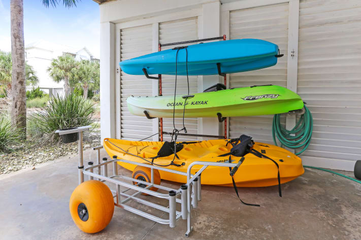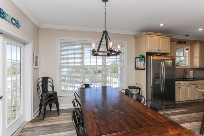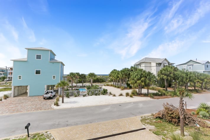 Veranda Views is a spacious, light-filled 5 bedroom/3 bath home in the Seagrass Community on Cape San Blas. This gulf view rental home also features a private pool which can be heated with additional fee as well as the community pool located adjacent to the Seagrass Clubhouse. On the exterior, you can enjoy the gulf views from one of the 2 levels of wraparound porches. Conveniently located, Veranda Views is just a short walk (150 steps to the private Seagrass boardwalk) to the beach and to Weber’s Donuts, the Cape Tradin’ Post and to the walk/run/bike path that stretches for 8 miles. As a convenience to you, 3 complimentary bicycles are provided.On the ground level you will find a private king bedroom suite complete with private bath and walk-in closet. There is also a large laundry with full size washing machine/dryer and ironing board. On the outside there is an enclosed hot/cold outdoor shower and a foot-washing station, ample covered parking for multiple vehicles plus a paver parking pad for a boat and a gas grill and shaded picnic table.