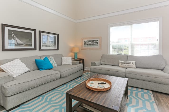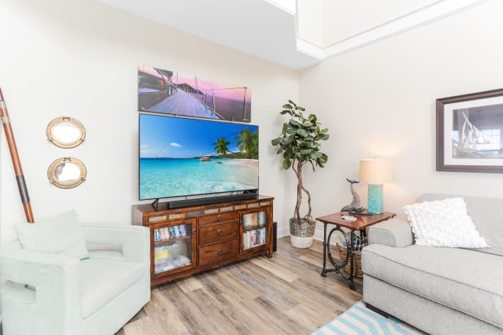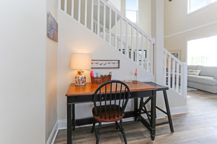 On the main level enjoy sunset views from the veranda. With an open floor plan, guests can spread out in the kitchen and dining areas and the light-filled, 2-story family. Seating for dinner will be comfortable with a farmhouse dining table seating 10 as well as the kitchen island lined with four chairs. If you prefer to take your meal outside, there is gulf view dining on the veranda that includes a bar-height table for four and a dining table for six. The fully stocked chef’s kitchen contains granite counters and stainless steel appliances. On this level there are two bedrooms. One with a queen bed and a private door to shared bath and the second is a bunk room with a twin bunk and separate twin. The shared bath has double vanities and step-in tiled rainfall shower. For those working while on vacation, there is a writing/computer desk for your use as well as a 65" Samsung SmartTV to enjoy.