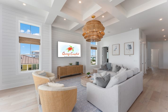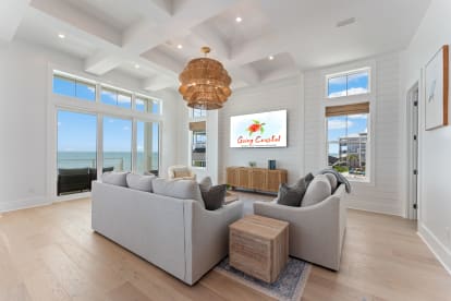 As you step inside, you’ll be immediately struck by the modern, fresh design and the high-end finishes that flow throughout the home. The spacious, open-concept living room and chef’s kitchen are located on the second floor, designed to maximize Gulf views and create a welcoming space for gathering.The living room features oversized windows, a stunning tray ceiling, and plush seating—perfect for movie nights, lively conversations, or simply soaking in the view. Step outside onto the expansive beachfront porch, where you can enjoy morning coffee or sunset cocktails with the soothing sound of waves in the background.