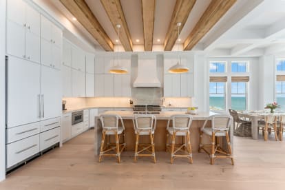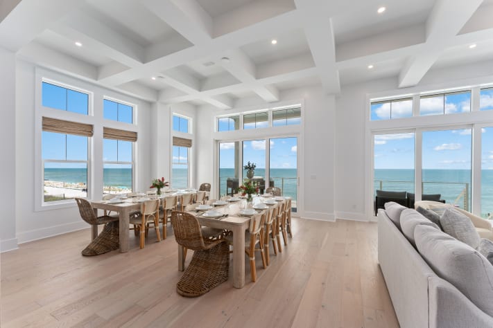 The chef’s kitchen is fully stocked for any culinary adventure, boasting top-of-the-line appliances, a large center island, and high-end cookware. Whether preparing casual beachside snacks or gourmet meals, this kitchen has everything you need. A spacious dining area ensures meals are always a special experience.
