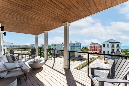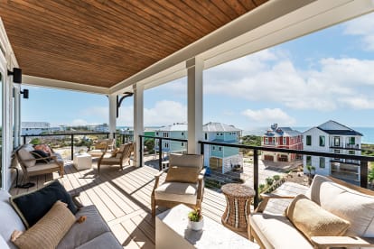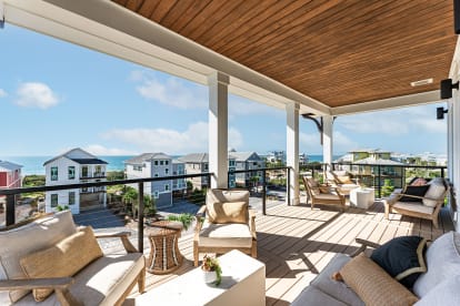 Deck: Large Gulf-front balcony with plush couches, perfect for relaxing or sunset cocktails