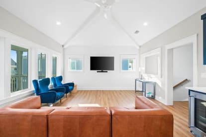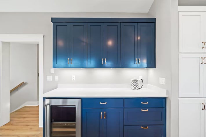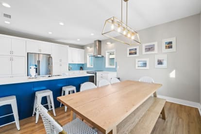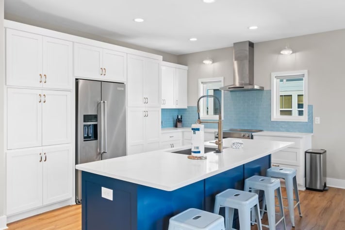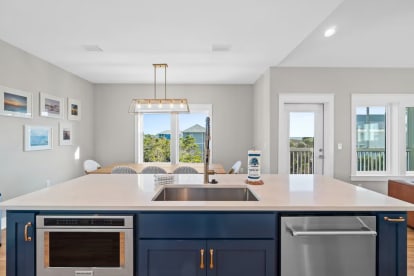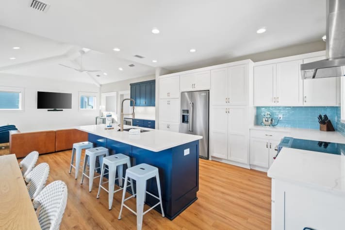 Inside, the large, well-stocked kitchen is a cook’s dream, complete with ample counter space, a kitchen island with four bar stools, and a dining table that seats six to eight. There’s even a beverage refrigerator for your favorite drinks.