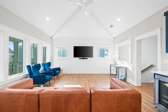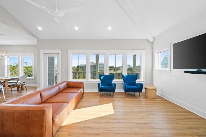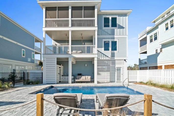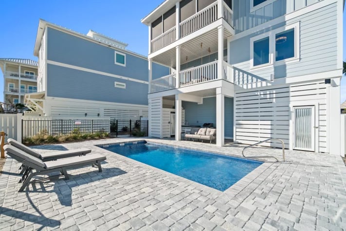Step outside to your private paradise, where you’ll find a sparkling pool with loungers, a grill, a fire pit, and an outdoor shower for convenience after a day at the beach. Each level of the home has its own balcony, perfect for enjoying the coastal breeze and stunning views. One balcony even features a swing bed, providing the ultimate spot to unwind. This pet-friendly retreat ensures your entire family, including furry members, can join in the fun. Pet fee is $150 per pet, max 2 (dogs only please). Pool heat can be added for an additional fee.