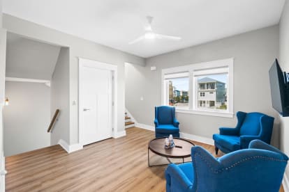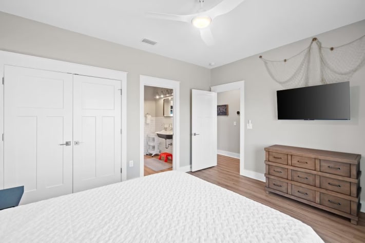 The living spaces are thoughtfully designed with comfort and entertainment in mind, offering games and books for both children and adults. The home features quiet, spacious, and comfortable bedrooms, designed to provide restful retreats after a day of beachside fun. Thoughtfully arranged to suit families and groups, the rooms include a mix of bedding options, including a Jack & Jill bath between the queen and bunk rooms, ensuring everyone has a cozy place to relax. The master suite is a tranquil haven, boasting a cozy window seat for peaceful moments of relaxation or to catch up on a good book.