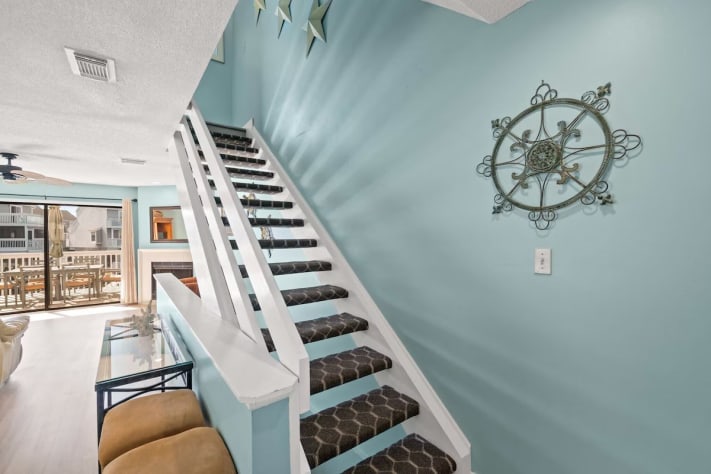 Leading from the kitchen level, you’ll ascend to the main living area. Here, you’ll find The Captain’s Quarters, the spacious master suite with a king bed and an attached bath for ultimate privacy and comfort. As you continue down the hall, you'll pass the laundry area, leading you to the queen bedroom, which also has its own attached bath.