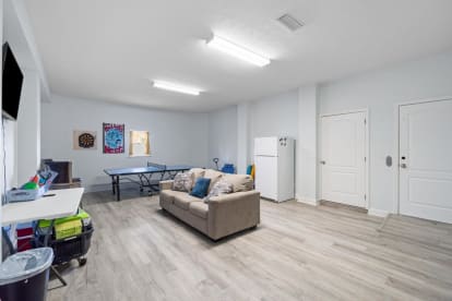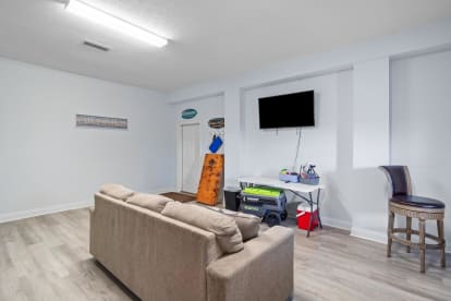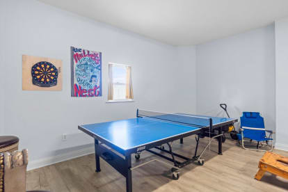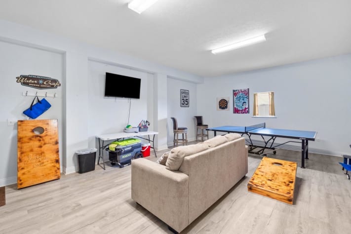 Game room with ping pong, couch & TV, second fridge, cornhole, coolers, and board games
