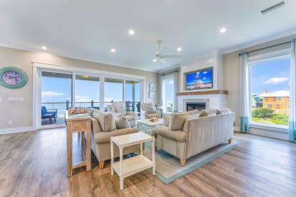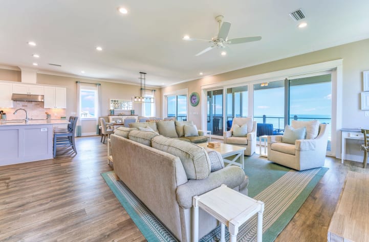 The main living space is open, inviting, and designed for gathering after a day at the beach.
