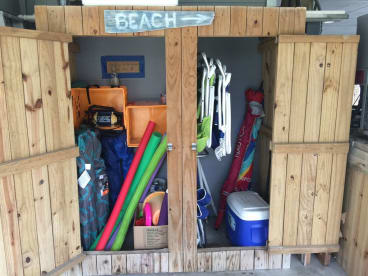 Underneath is parking for 2 vehicles, one is covered. You can park your boat in the designated area within the community. There is an enclosed outside shower with hot and cold water. This is great for washing off the sand and having a 3rd shower! There is a beach locker with beach cart, beach chairs, umbrella, rolling cooler, sand and water toys and we also provide beach towels so you are all set to enjoy the beach!