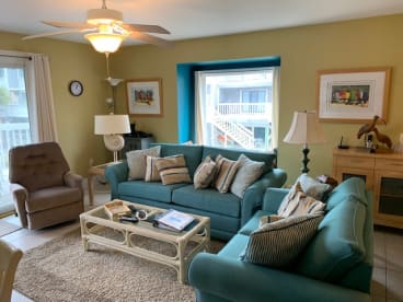 Funseeker was a perfect place for our family of four and dog. Jennie did a great job of following up and making sure our stay was perfect. We didn't have any issues while there. The unit featured great WiFi, great TV, comfortable furniture and a great deck overlooking a fountained pond with turtles and fish. We fed the turtles off of our deck. You can even see the beach from the Master bedroom deck. Speaking of the beach, it is only a few steps away. A bonus was Netflix available for watching as well. Provided in the unit was beach towels, all the small appliances you need, beach chairs and an umbrella. Will definitely choose Funseeker again.