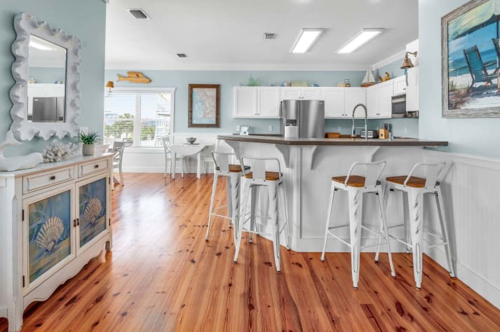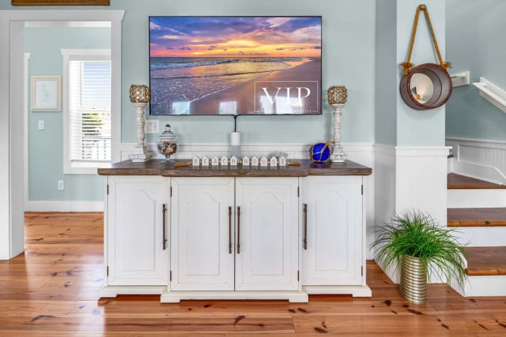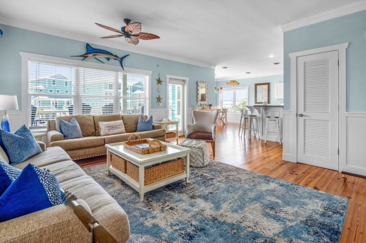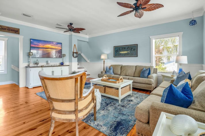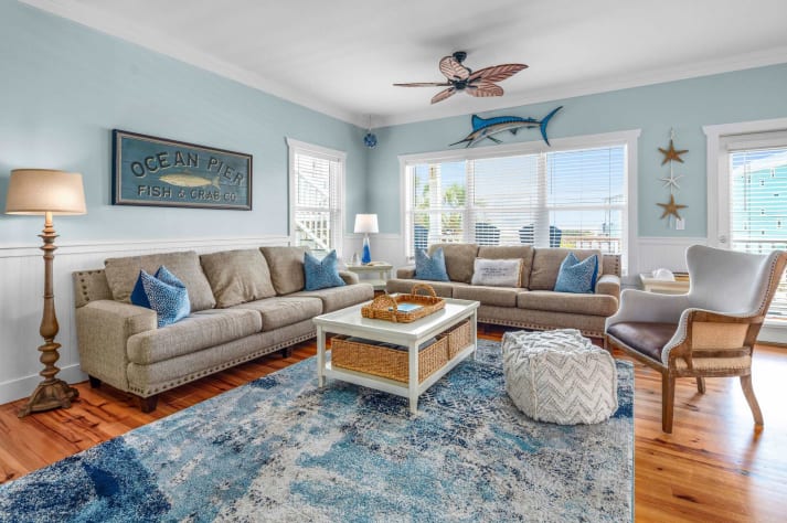 The nautical decor and the warm, comfortable atmosphere makes you feel right at home. All new electronics including a 65' LCD flat screen TV in the living area and 43" flat screen TV's in the bedrooms. New large-capacity washer and dryer, side-by-side refrigerator, microwave, etc. Seating for 12 in the dining room/kitchen. Adults can enjoy privacy upstairs on the 3rd floor in three separate bedrooms, while children can have their own area with bunk beds on the ground floor. There is also a daybed in the third floor sitting area for larger families.